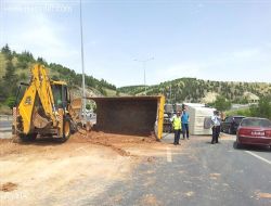 Edinilen bilgiye göre, Ankara-Konya Yolu'nda hafriyat çalışması yapan, 06 HA 9763 plakalı sürücüsünün kimliği öğrenilemeyen kum yüklü kamyon devrildi. Kazada hafif şekilde yaralanan sürücü hastaneye kaldırılarak tedavi altına alındı.