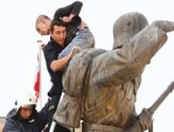 Genç, heykele konulan merdivenle itfaiye erleri tarafından vatandaşların alkışları eşliğinde aşağıya indirildi.